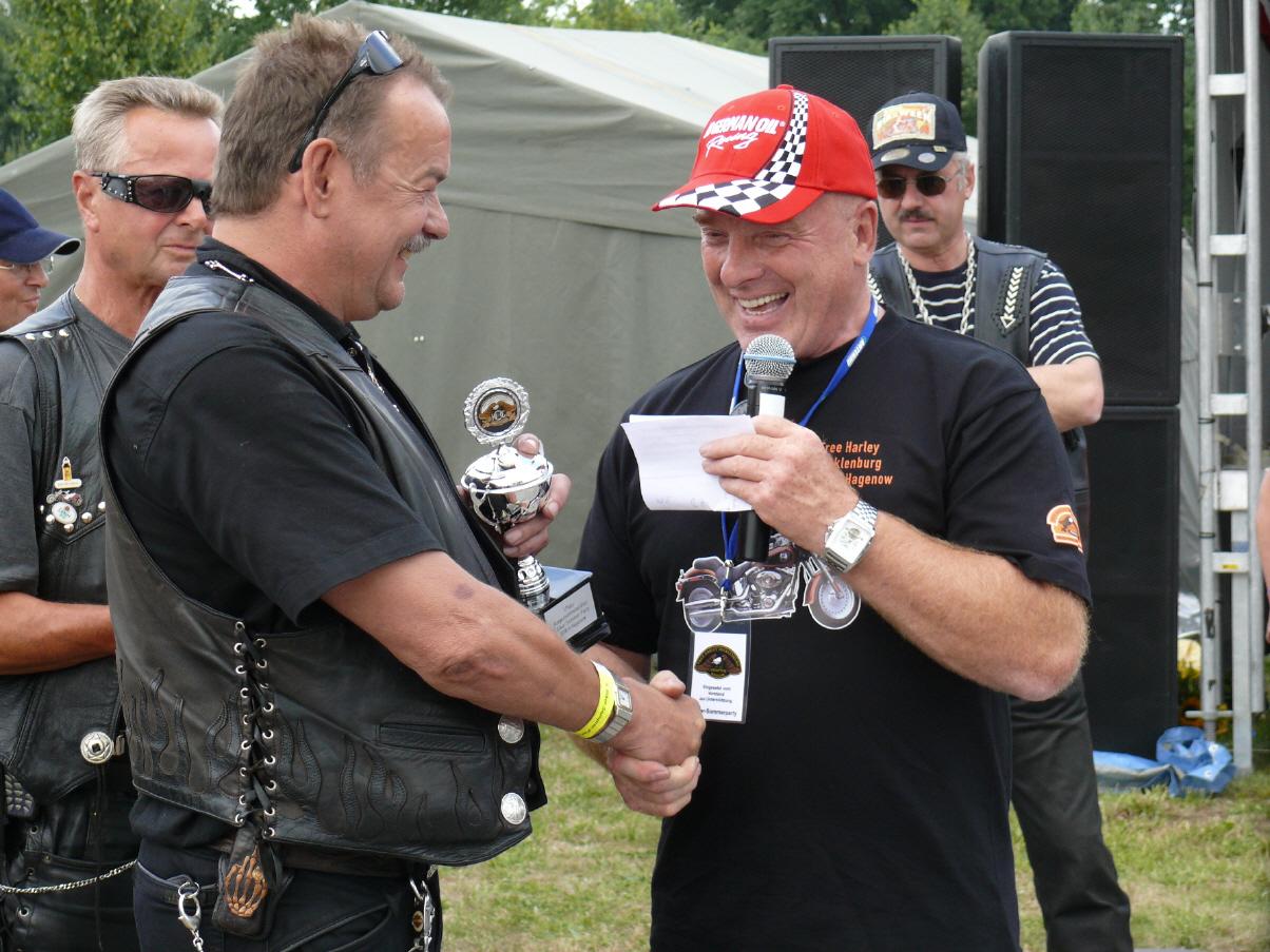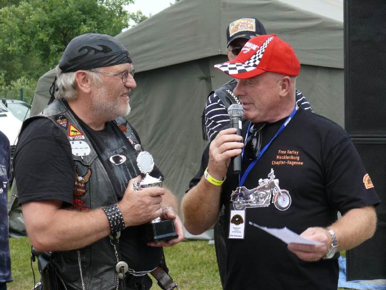 Für das schönste Bike konte Ralph aus Hamburg einen Pokal entgegennehmen. Den zweiten Preis erhielt Paul aus Parchim und den 3. Preis Wiardus aus Sondershausen. Ältester Biker war der 75 - jährige Heinz Könnecke aus Kiel. Die weiteste Anreise mit 690 Kilometer hatte Siegfried Wewera aus dem saarländischen Zweibrücken.