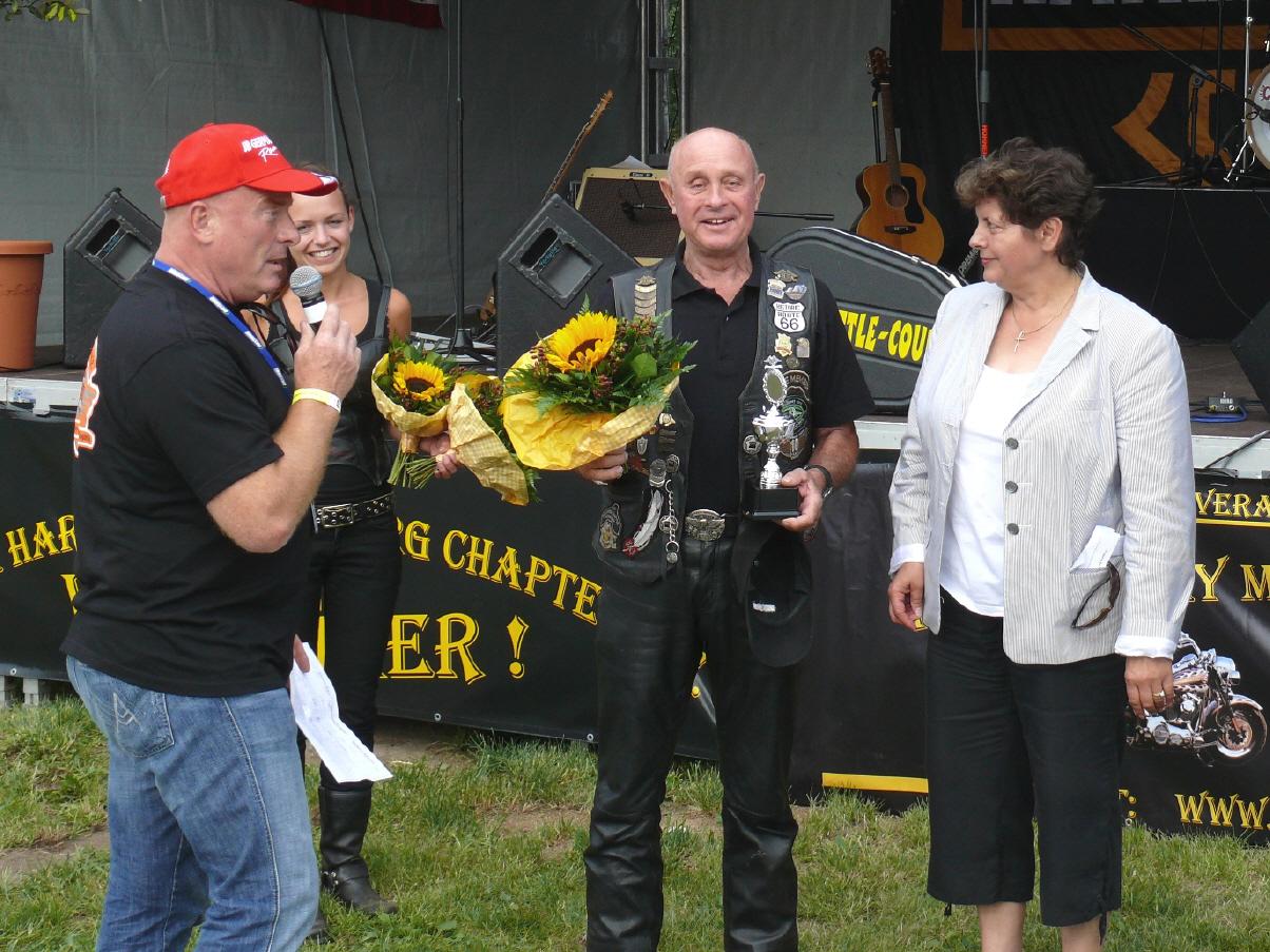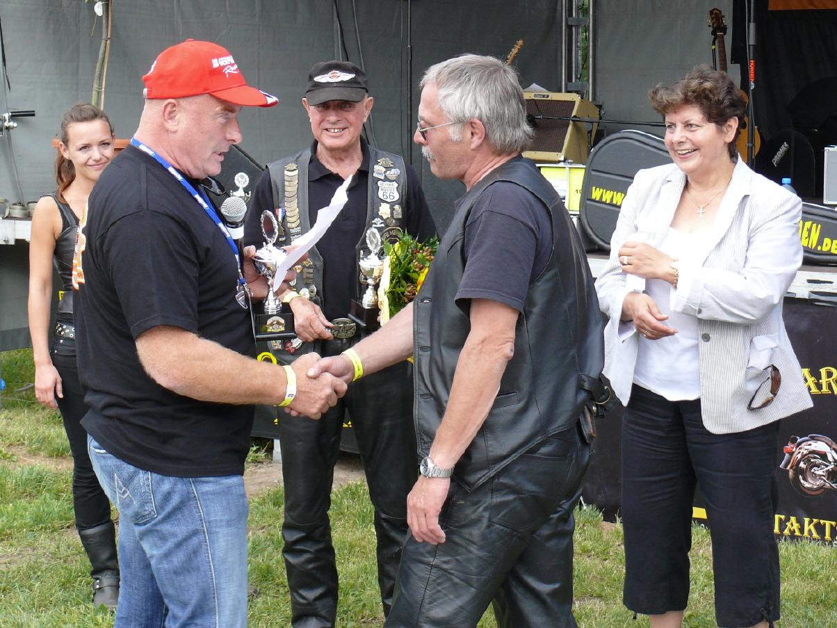 In Anwesenheit der Bürgermeisterin nahm der mehrmalige Weltmeister Jürgen Baumgarten die Ehrungen vor. Pokale erhielten die Halter der schönsten Bikes, der älteste Biker, die weiteste Anreise und das größte anwesende Chapter.