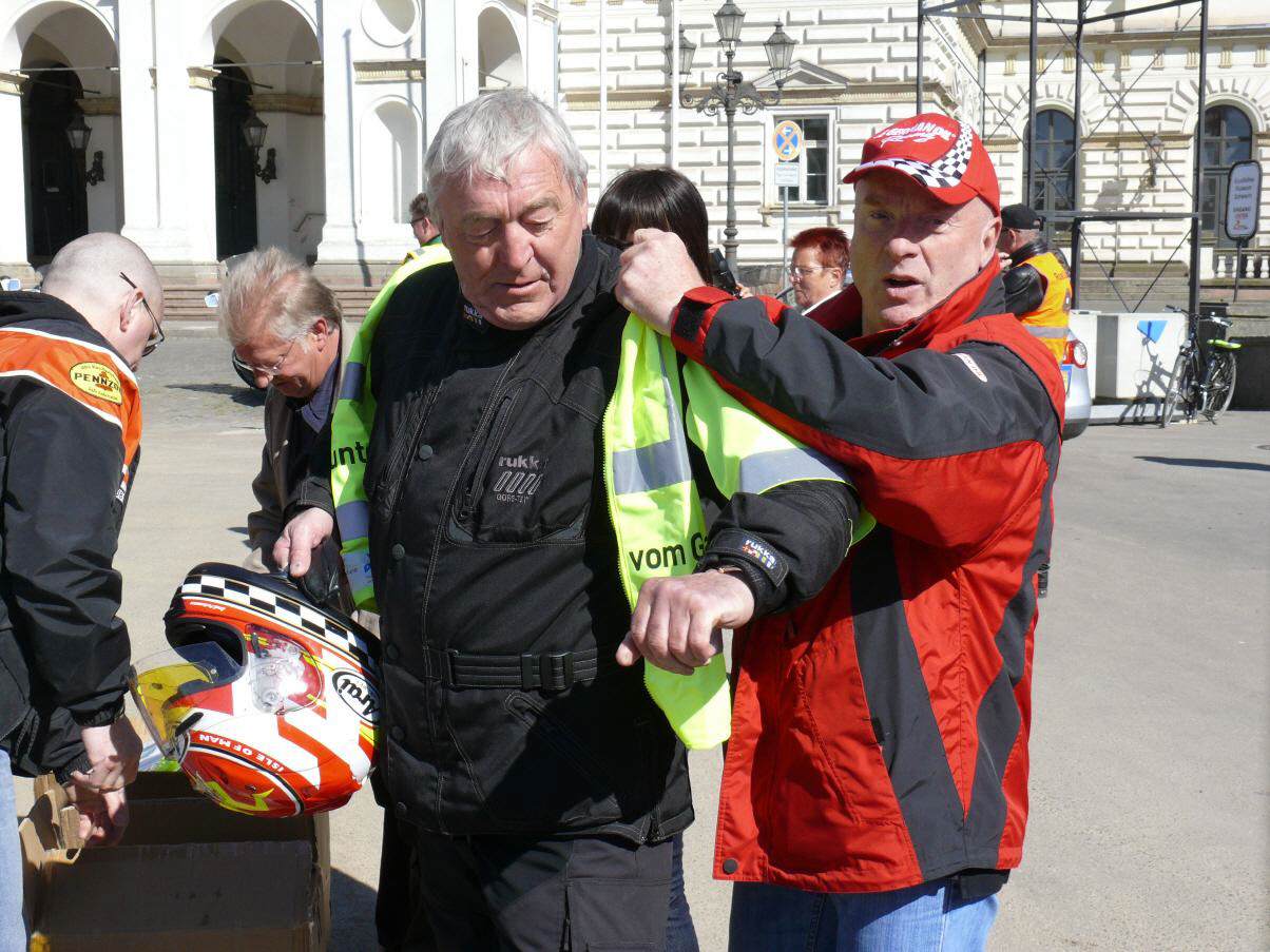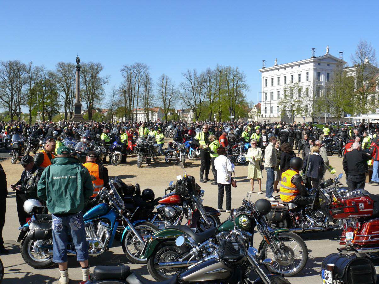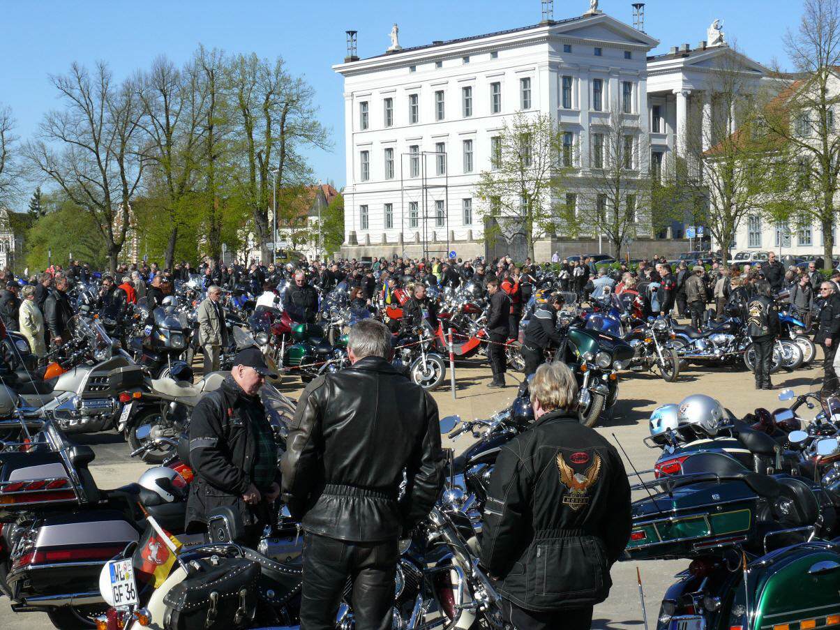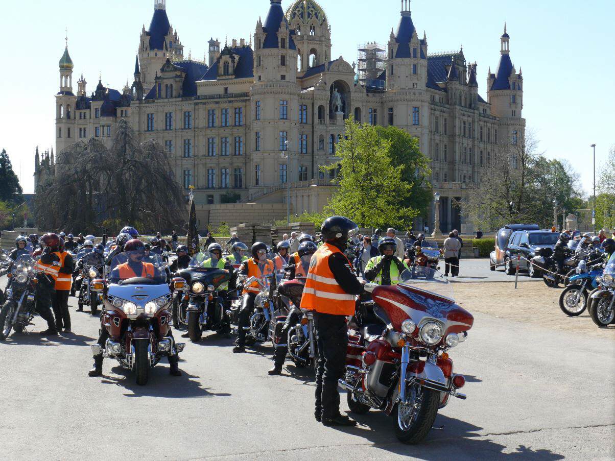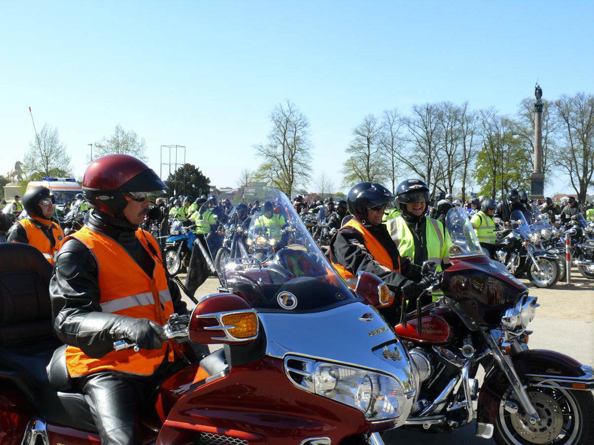 An die 450 Bikerinnen und Biker trafen sich am 19. April in Schwerin auf dem Alten Garten zu unserem diesjährigen symbolischen Saisonstart. Vor dem Start zur gemeinsamen Ausfahrt unterstützte unser Chapter die bundesweite Verkehrssicherheitsaktion "Runter vom Gas". Der vom Bundesverkehrsminister eingesetzte Sicherheitsbeauftragte Jürgen Baumgarten fand dabei reißende Abnehmer für die im Rahmen dieser Aktion angebotenen Sicherheitswesten mit der Aufschrift "Runter vom Gas".