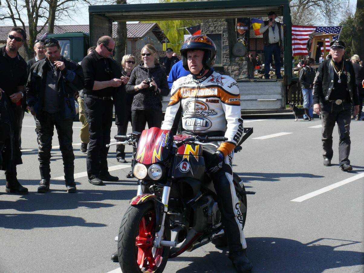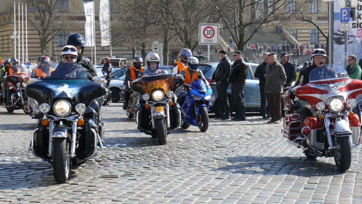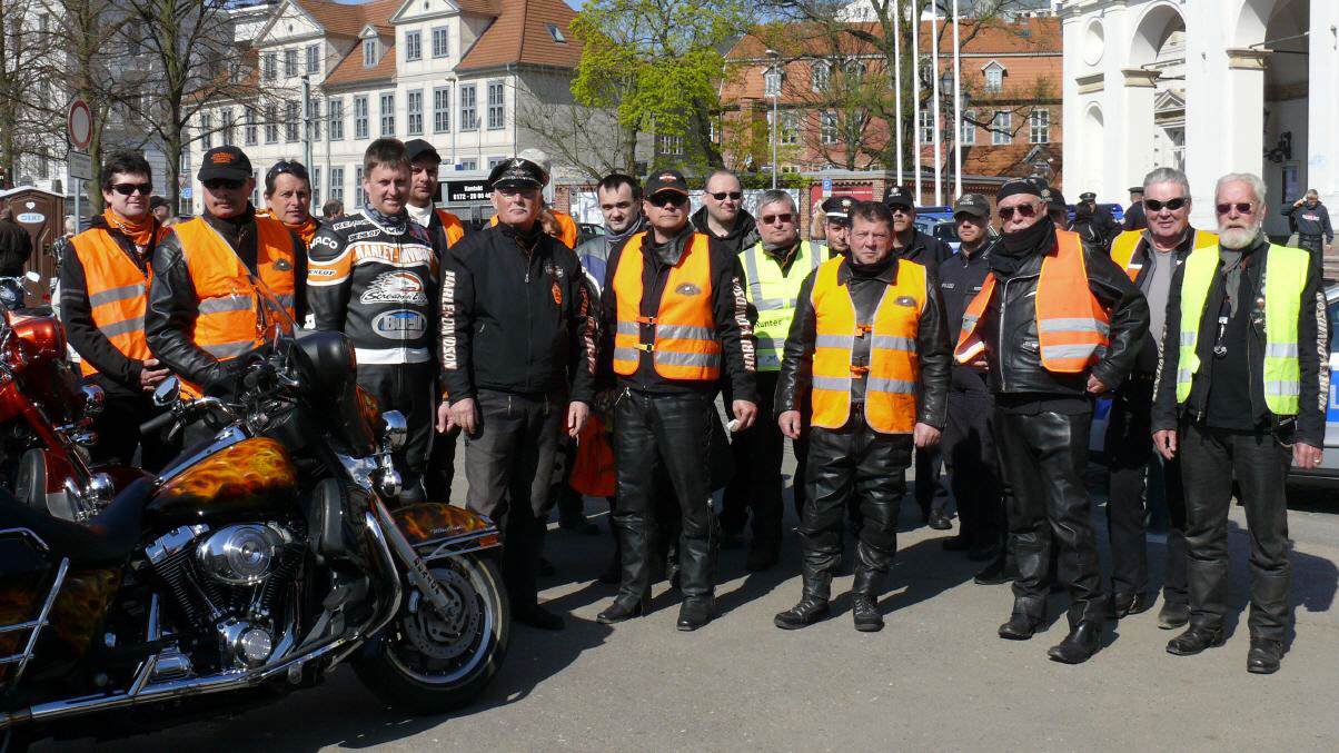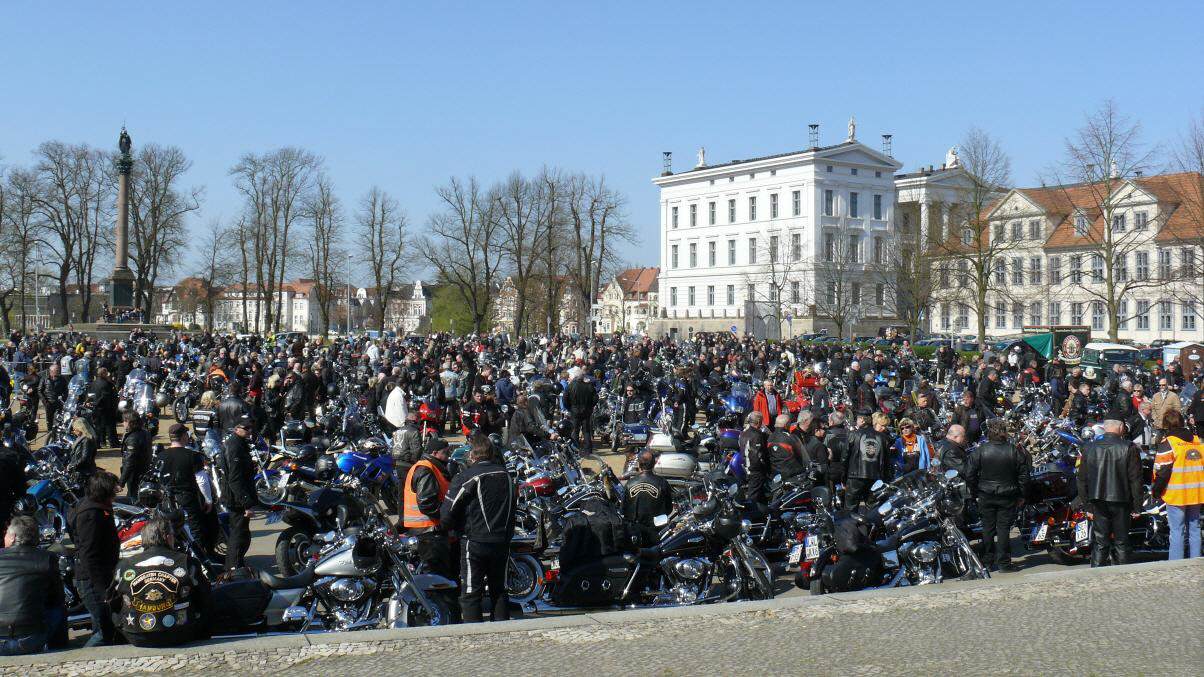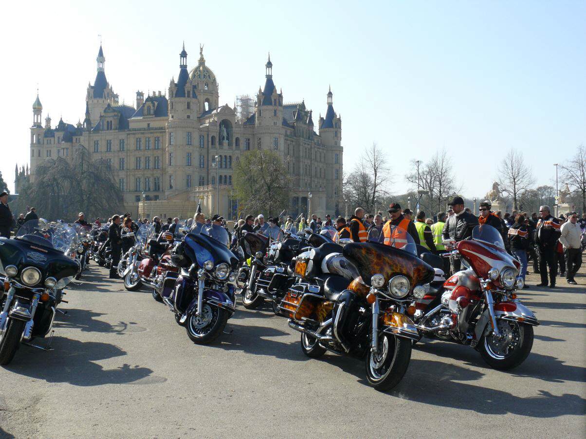 Bei bestem Frühlingswetter versammelten sich am 18.April an die 560 Biker mit Sozius zum gemeinsamen Saisonstart mit Europas bekanntesten Stuntfahrer für Harley-Davidson & Buell Reiner Schwarz in Schwerin auf dem Alten Garten. Pünktlich um 11:00 Uhr setzte sich die kilometerlange Bikerkolonne mit Reiner Schwarz in Bewegung.