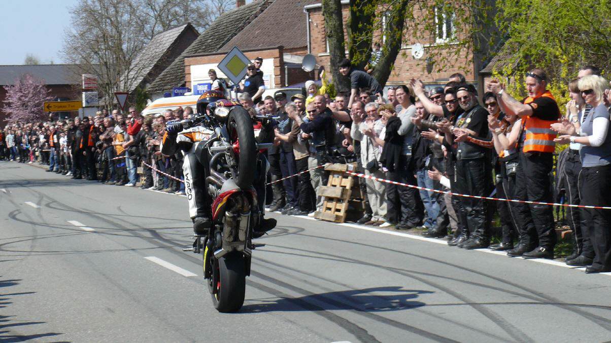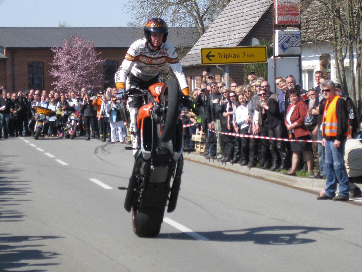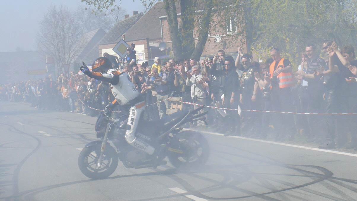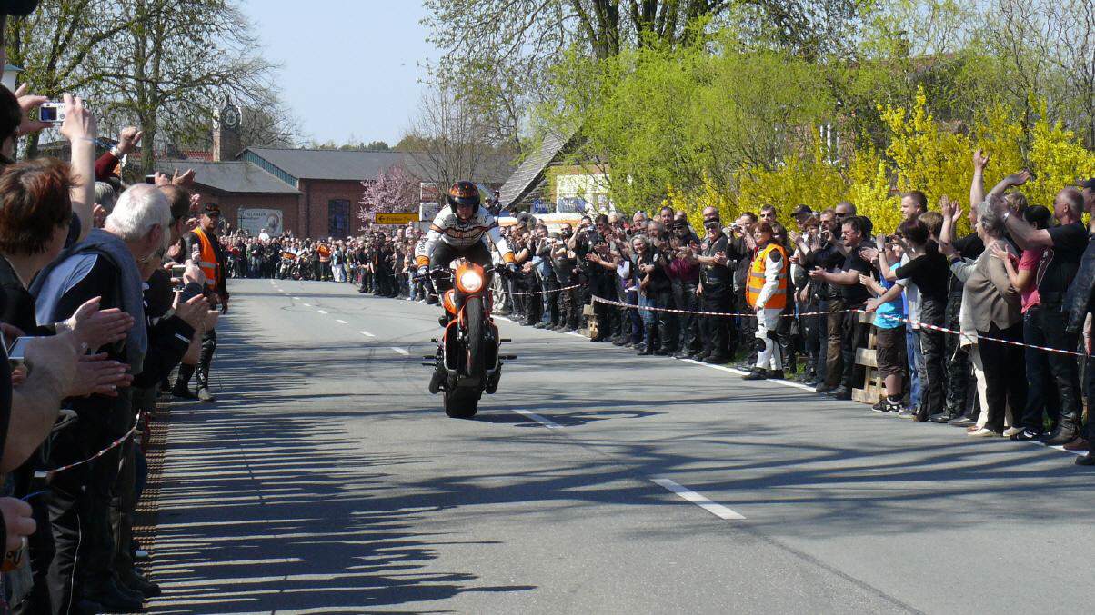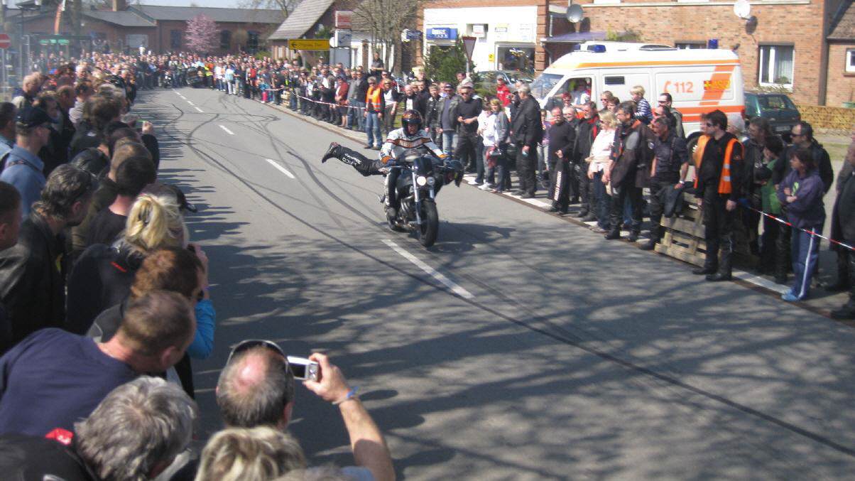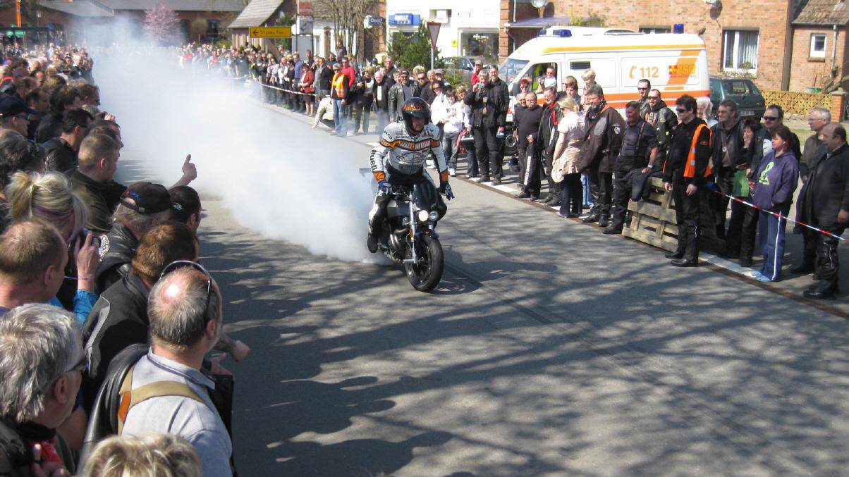 In Vielank angekommen, waren es dann gut und gerne über 740 Biker mit Ihren Sozius. Die Show mit Reiner Schwarz erlebten dann über 950 Biker und Motorradfreunde aus ganz Norddeutschland. Alle die gekommen waren, sahen eine Show der Extraklasse. Mit rasender Geschwindigkeit und scheinbar spielerisch wuchtete Reiner Schwarz die schweren Maschinen auf den Hinterreifen und balancierte sie mit qualmenden Reifen über die Strecke.