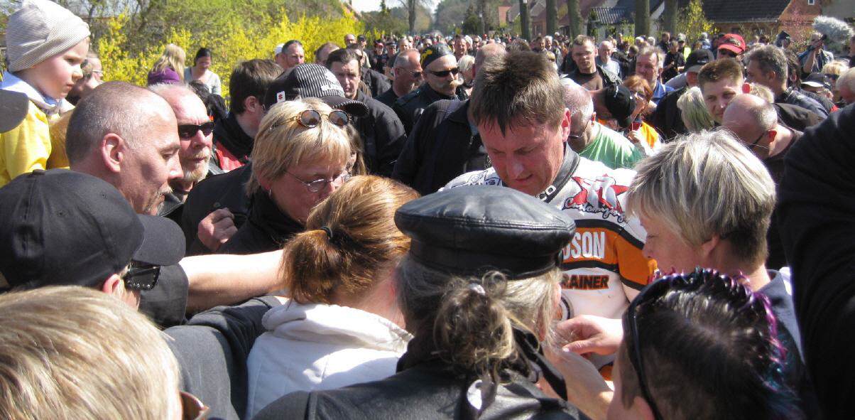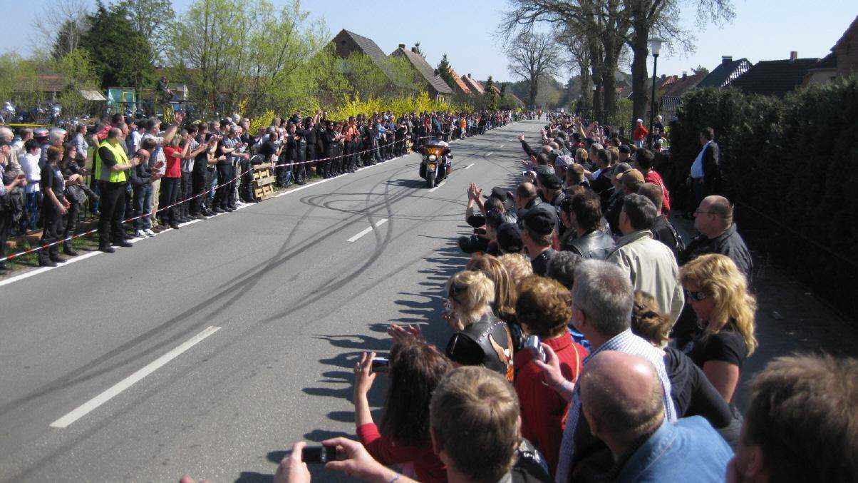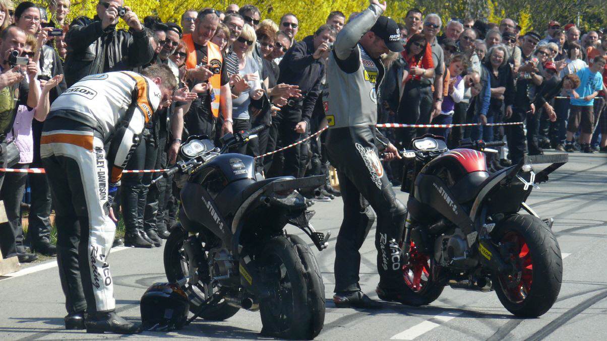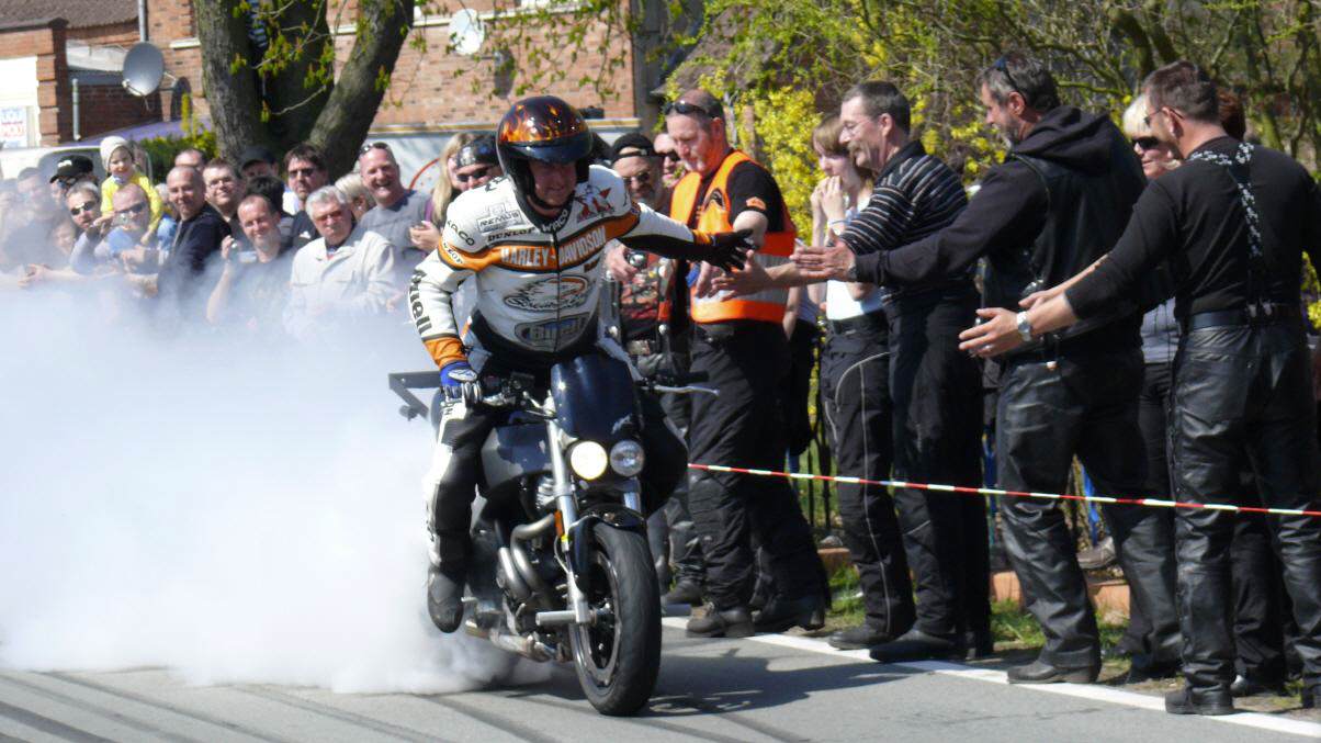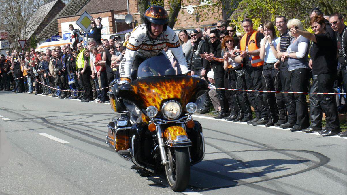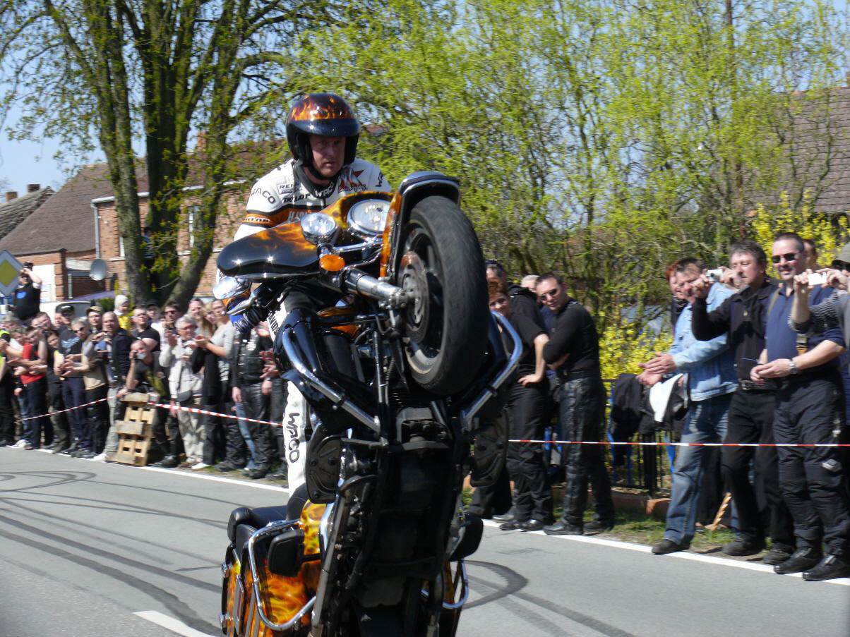 In Vielank angekommen, waren es dann gut und gerne über 740 Biker mit Ihren Sozius. Die Show mit Reiner Schwarz erlebten dann über 950 Biker und Motorradfreunde aus ganz Norddeutschland. Alle die gekommen waren, sahen eine Show der Extraklasse. Mit rasender Geschwindigkeit und scheinbar spielerisch wuchtete Reiner Schwarz die schweren Maschinen auf den Hinterreifen und balancierte sie mit qualmenden Reifen über die Strecke.